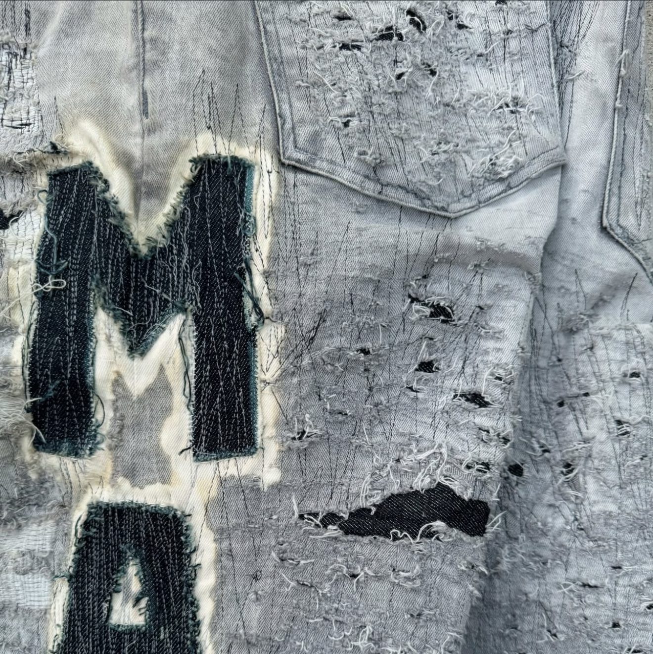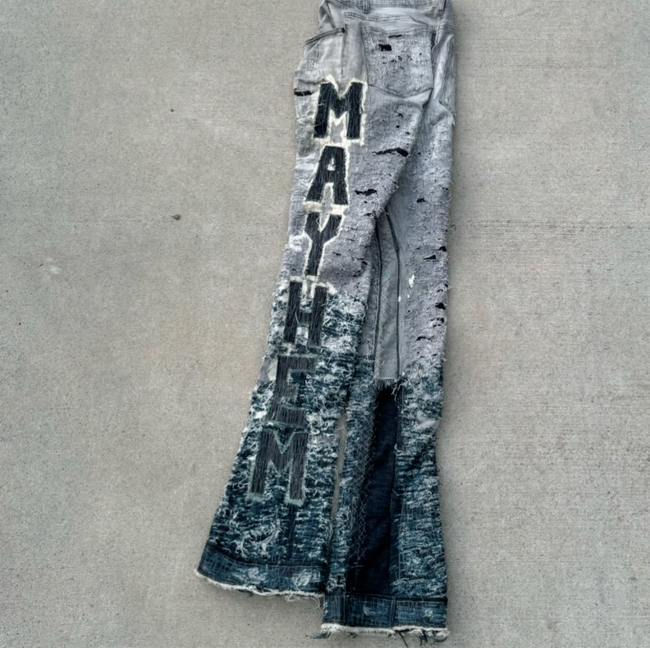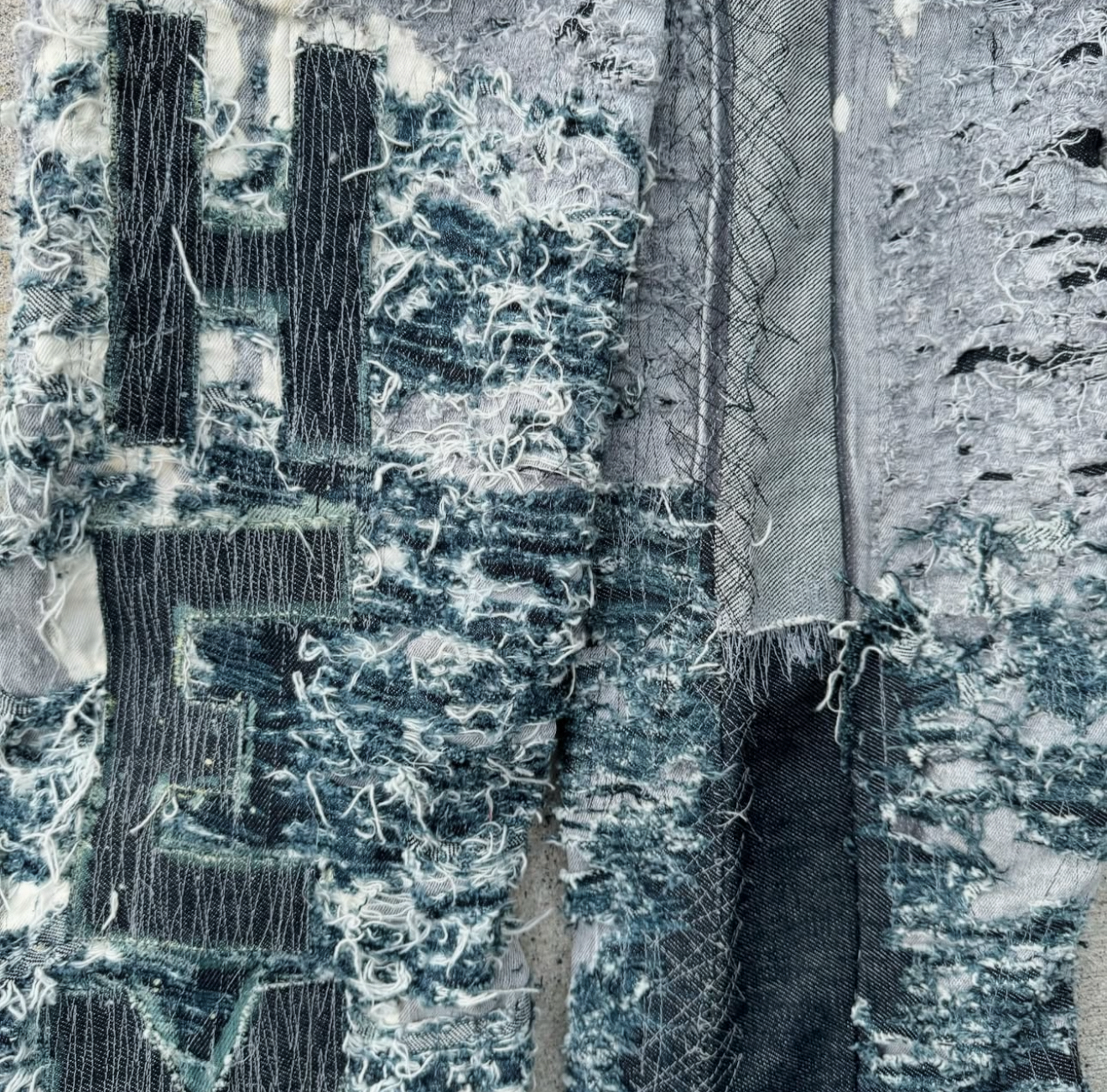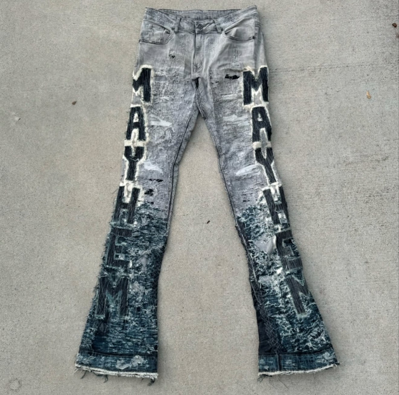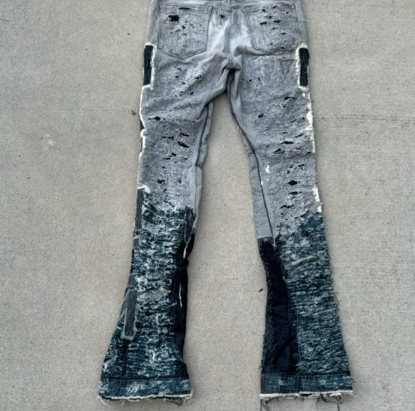 one of one stacked and stitched jeans
